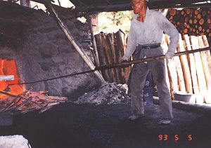 もう10年も前になりますが、一番お世話になった大風長作(おおかぜちょうさく)さんが炭を釜から取り出す写真を載せてみました。炭には白炭(はくたん)と黒炭(こくたん)があり、写真は白炭です。